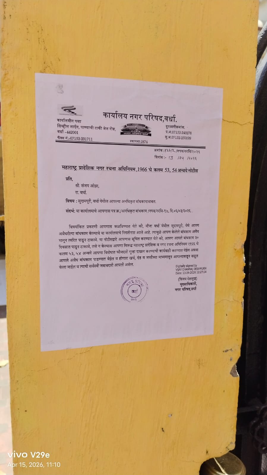 वर्धा:पत्रकारितेच्या नावाखाली खंडणी उकळणे आणि प्रशासकीय अधिकाऱ्यांना वेठीस धरणे, असे प्रकार सध्या जिल्ह्यात चर्चेचा विषय ठरत आहेत. यातच ‘एका हिंदी दैनिका चे वर्धा जिल्हा प्रतिनिधी संजय ओझा उर्फ ‘लकवा मॅन’ यांचे अनधिकृत बांधकाम आता प्रशासनाच्या रडारवर आले असून, नगरपरिषदेने त्यांना बांधकाम पाडण्याची नोटीस बजावल्याने खळबळ उडाली आहे.