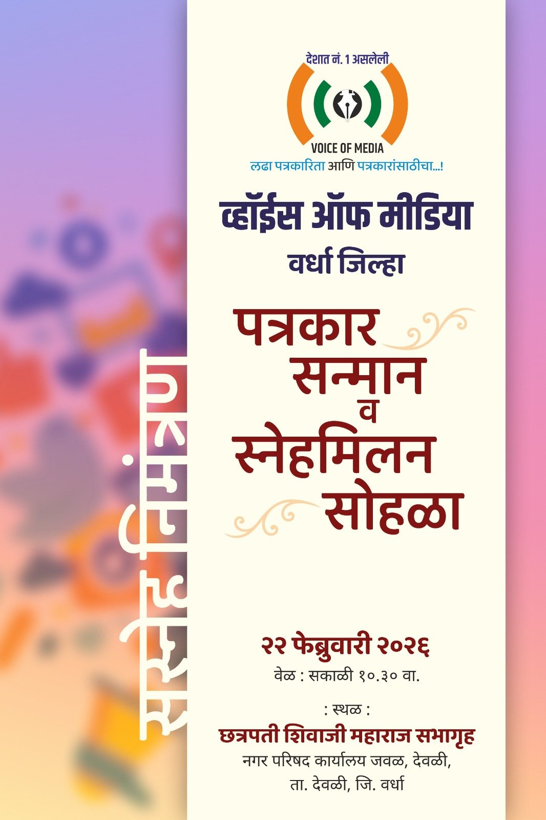 पत्रकारितेचे मुख्य उद्दिष्ट समजून घेणे, पत्रकारांचे संघटन अधिक मजबूत करणे आणि त्यांच्या कार्याची पावती म्हणून जिल्हयातील पत्रकारांचा सन्मान करण्यासाठी ‘व्हॉइस ऑफ मीडिया’ वर्धा जिल्ह्याच्या वतीने एका विशेष सोहळ्याचे आयोजन करण्यात आले आहे. हा ‘पत्रकार सन्मान व स्नेहमिलन सोहळा’ येत्या २२ फेब्रुवारी रोजी देवळी येथे संपन्न होणार आहे.